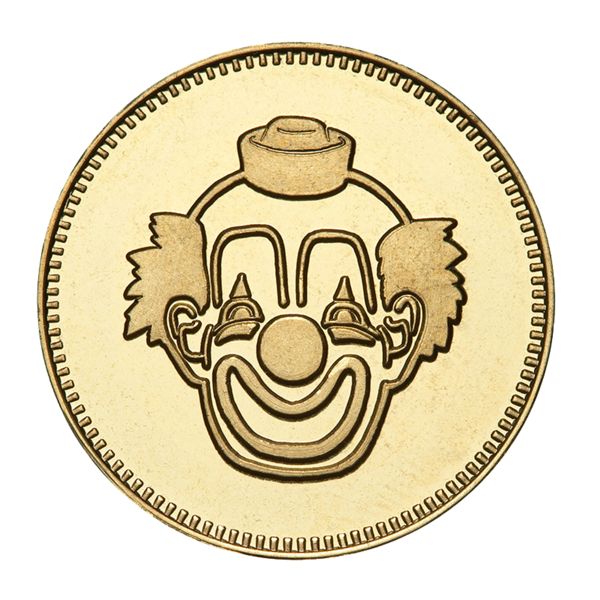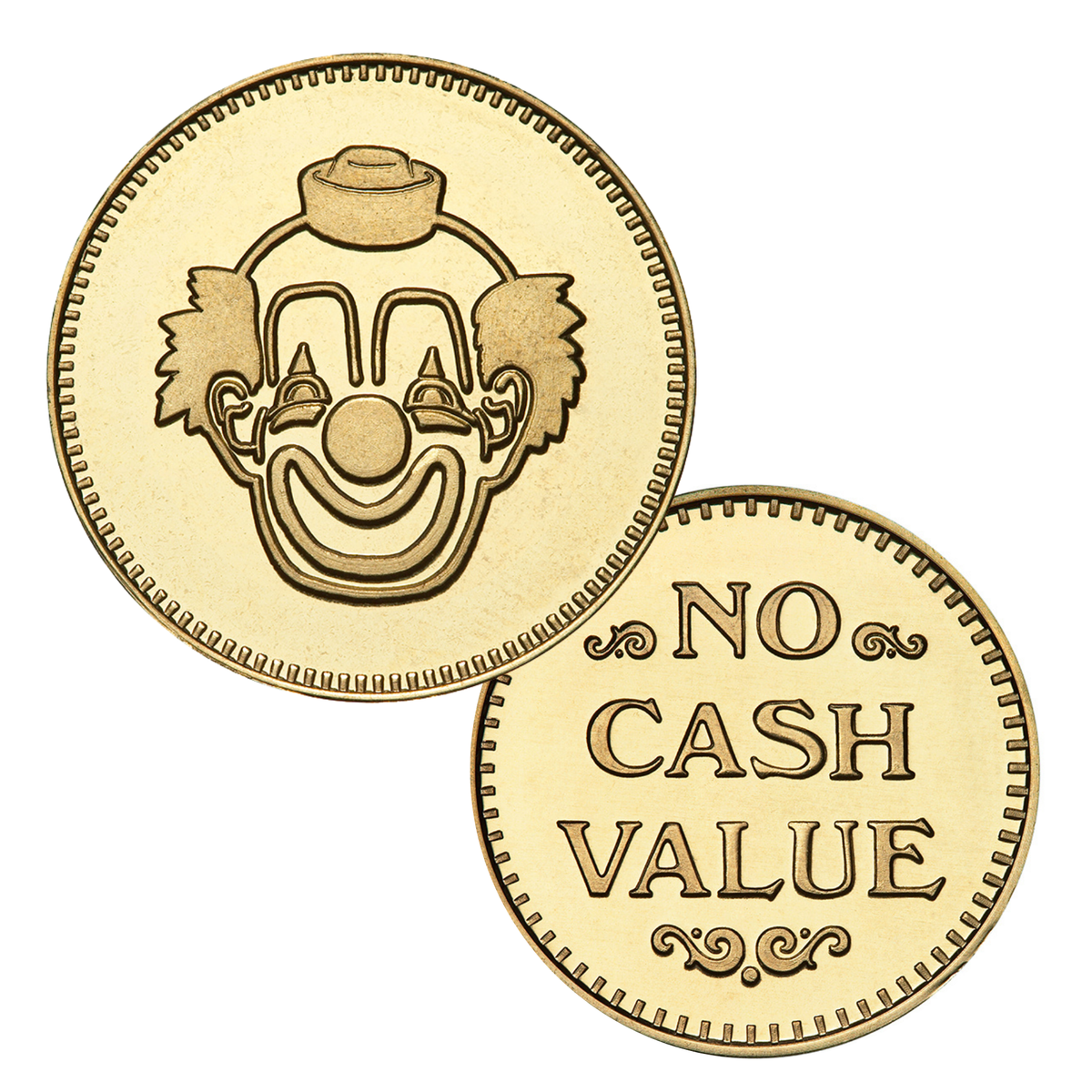 Order 0.800" Brass Clown No Cash Value Tokens, ideal for video games and amusement centers. These durable brass tokens are in stock and ship within 1-2 business days. Minimum order of 3,000 tokens.