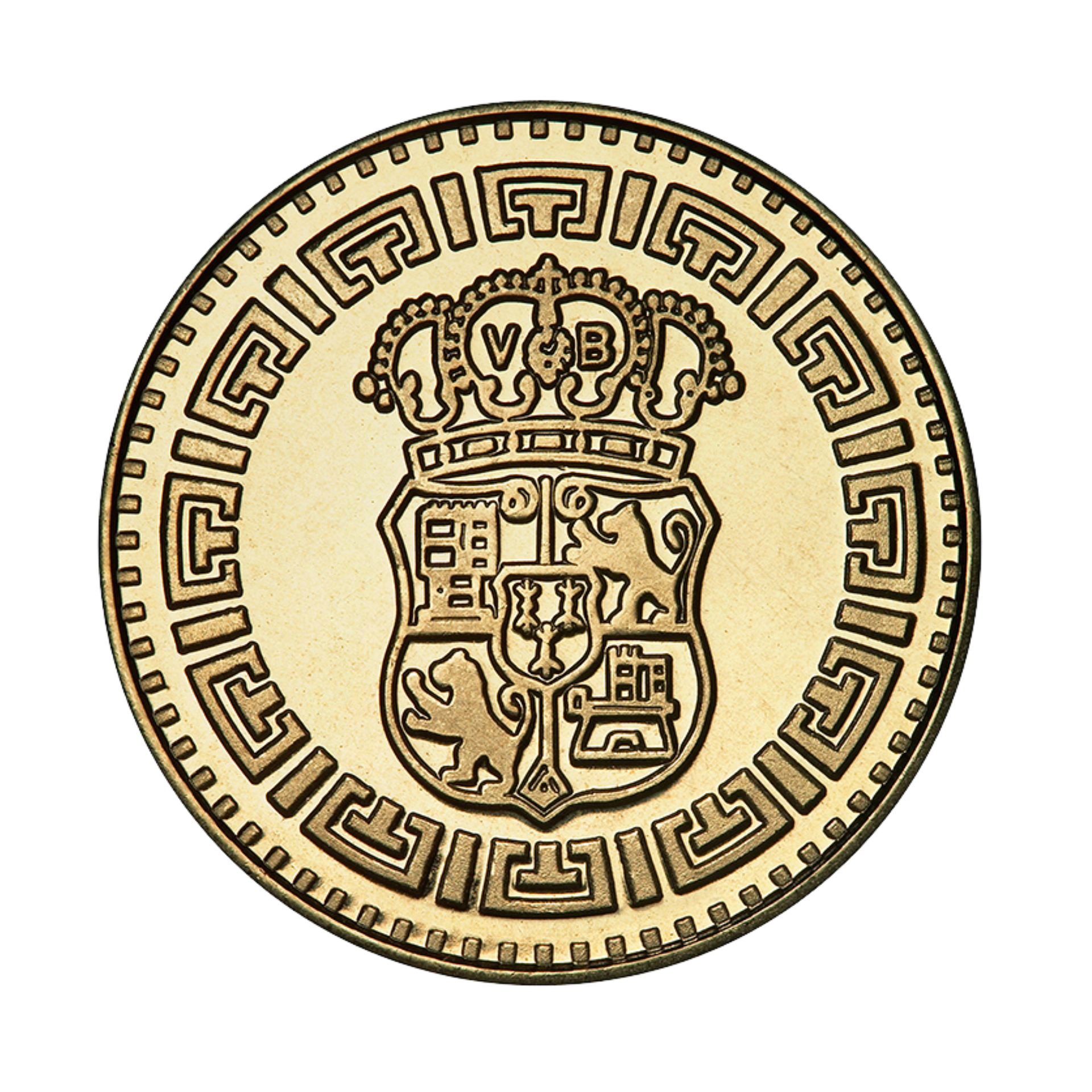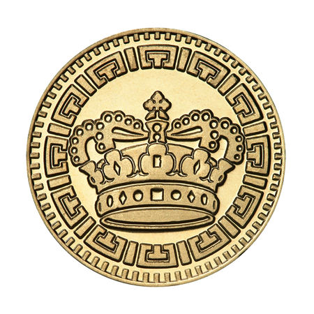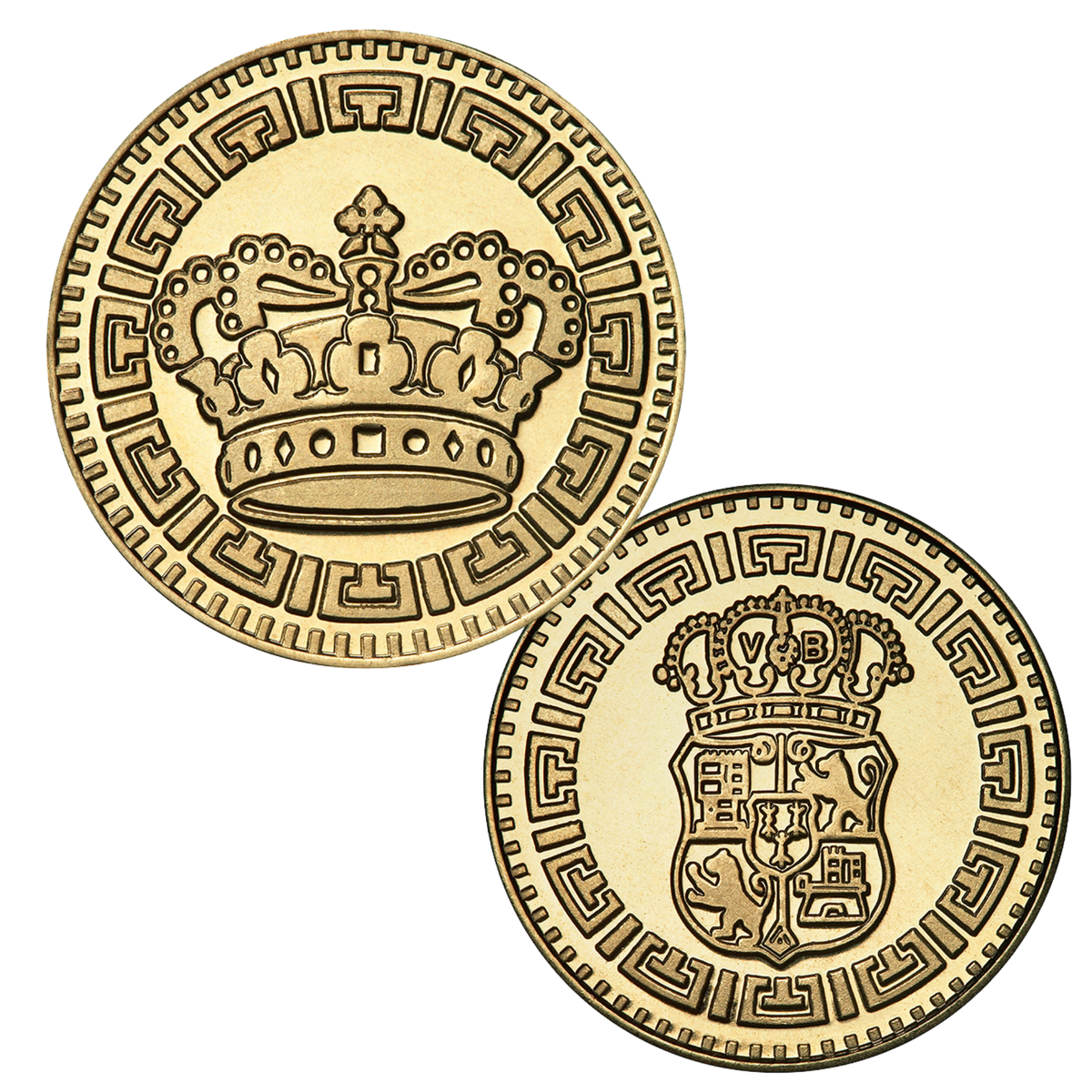 This 1.125" brass token features a Crown design on one side and a Crest on the other. Crafted for durability, it has a plain finish and a thickness of 0.058", ensuring smooth operation in token-operated systems. Made from high-quality brass, this token is ideal for businesses needing secure and long-lasting token solutions.
