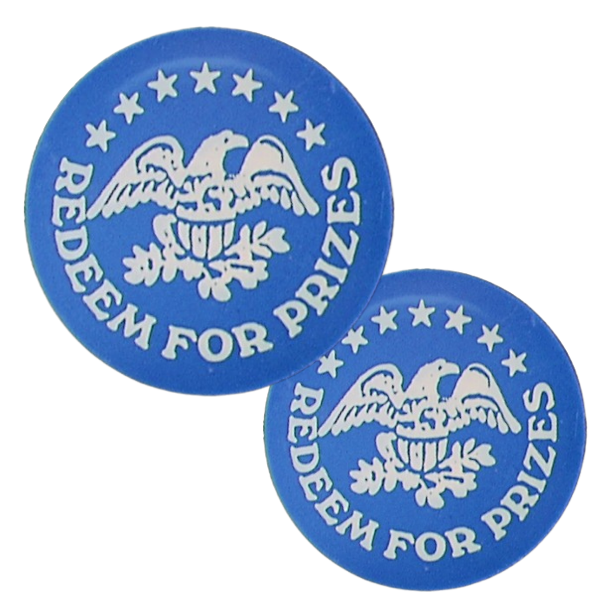This 1.63" blue plastic token features a "Redeem for Prizes" design with an Eagle and Stars motif. Lightweight yet durable, it is crafted from high-quality plastic for reliable performance in prize redemption systems such as arcades and amusement centers. With a thickness of 0.070", it ensures smooth operation and cost efficiency.