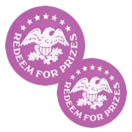 This 1.63" purple plastic token features a "Redeem for Prizes" design with an Eagle and Stars motif. Crafted from durable plastic, it???s lightweight and perfect for prize redemption systems at arcades, amusement centers, or similar venues. With a thickness of 0.070", it combines functionality and affordability.